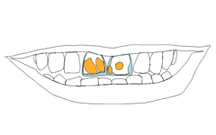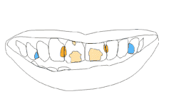 Photo 3: Age: 55 years – discolouration of old fillings (orange) and on the surface of teeth (shaded orange) as well as gold fillings (blue) are clearly noticeable.