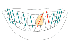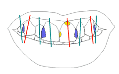 Photo 6: Age: 18 years – tooth decay (yellow) as well as a shortage of space leading to teeth being bunched up (shaded blue) and therefore also incorrectly aligned dental axes in some areas (red lines) lead to a strongly inhibited smile.