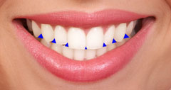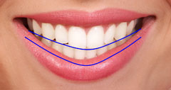 When smiling, the gums should not be overly visible. The gum line should be as symmetrical as possible, most importantly above the two large incisors, and should gently rise towards the back. The gums completely fill the area between the teeth, curving down in an arch shape with so-called “papillae”.