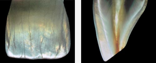 Left: When looking at incisors in transmitted light, the colour pigments embedded in the tooth structure can easily be seen.